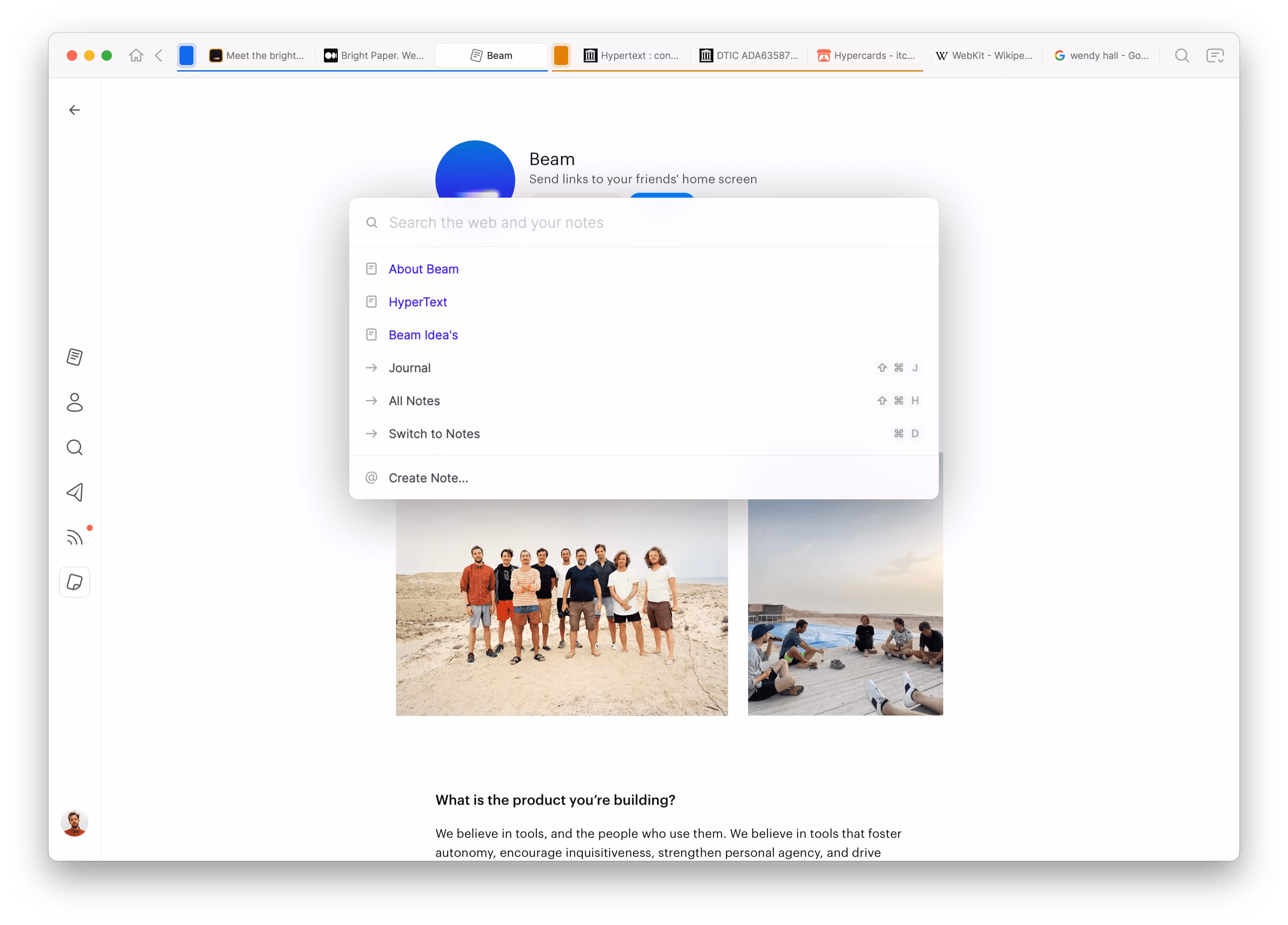 The Beam browser is an native macOS web browser with a built in note editor. It's has features to collect any web content, automatically group your tabs and publish your notes. It's a new way to collect your thoughts and experience the internet.