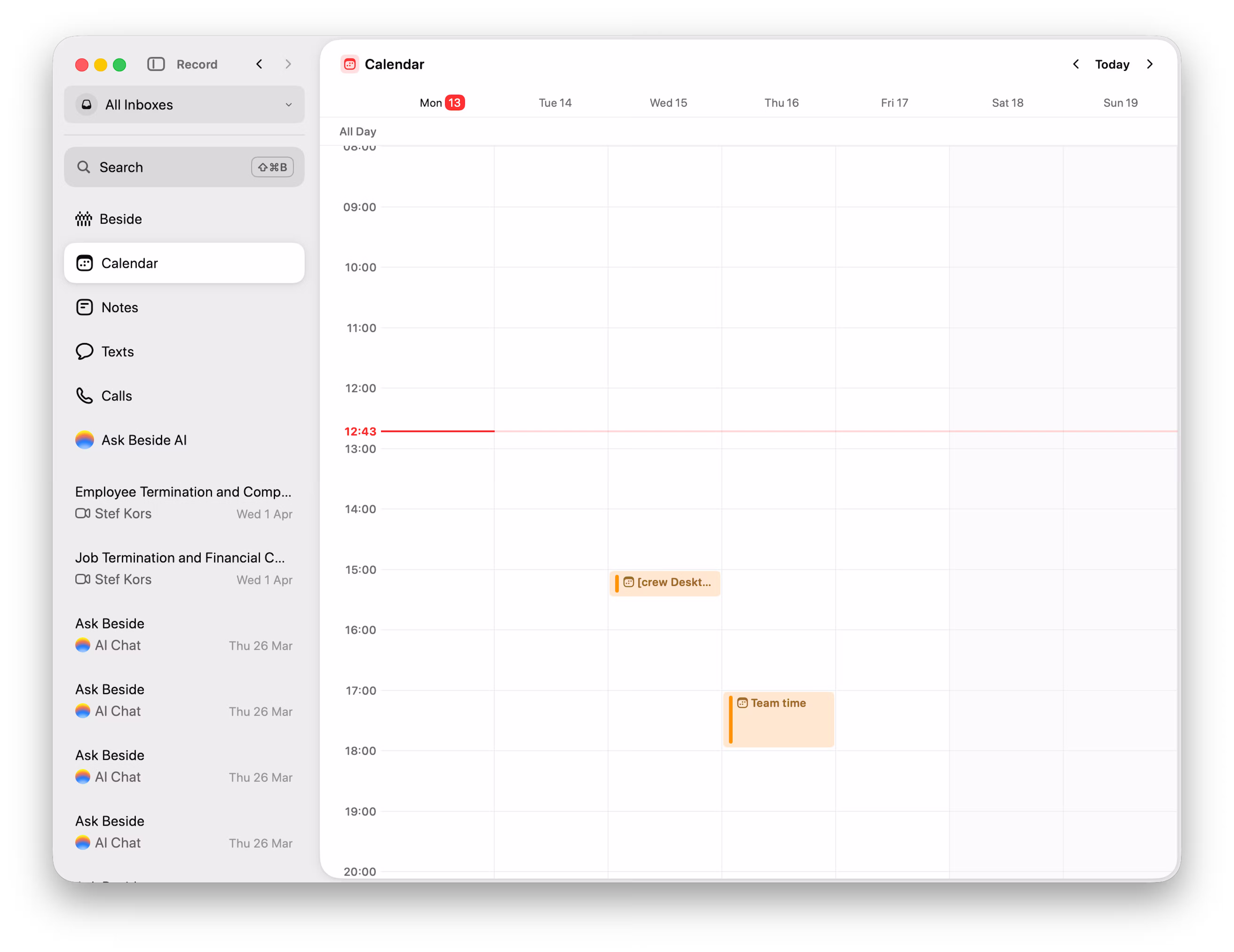 Beside (formerly named Interface.inc) is an AI receptionist and Meeting Recorder shipping across macOS, iOS, web, and Windows. I operated as an engineering-first product builder owning features from concept through to production across every client.